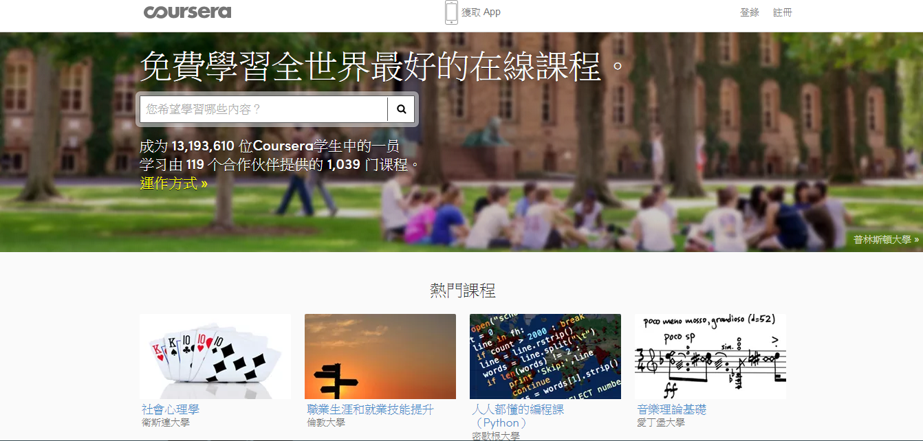 由美國史丹佛大學兩位計算機科學教授創辦的營利性教育科技公司,規模龐大,開課種類及數量是目前的MOOC當中最多的!Coursera已和多所大學合作,包括史丹佛大學、密西根大學、普林斯頓大學、賓州大學......如果你在裡面發現了耶魯大學、倫敦大學,甚至是北京大學的課程,請別意外。台大也加入了他們的行列,陸續增加了不少中文化的課程,網站「支援中文」是許多華文使用者的一大福音!